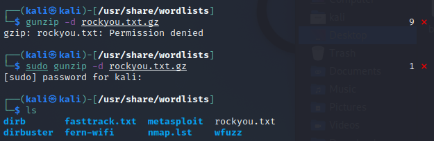 sudo gunzip -d /usr/share/wordlists/rockyou.txt.gz