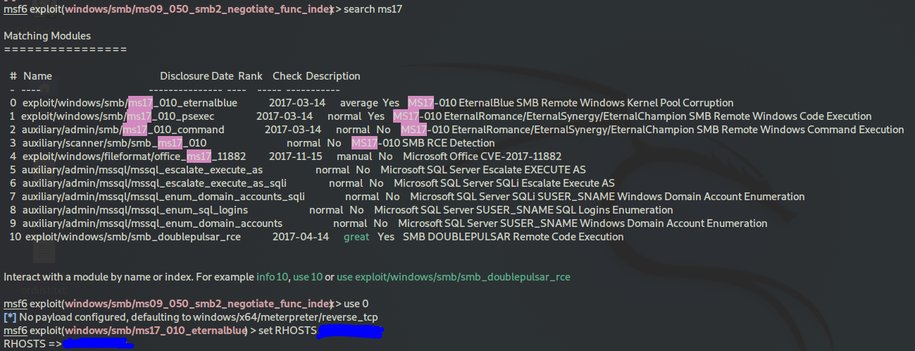 ((Preface = this was a major headache for me as I had to restart the target machine multiple times because sometimes the exploit worked and mostly it failed. Had to restart my own machine once. I first had a successful exploit by using a "generic/shell_reverse_tcp" payload. And was able to spawn a reverse command shell and successfully grab the flag. However, backgrounding the sessions and attempting to spawn/upgrade to a meterpreter shell so that I could use the hashdump functionality (search hashdump), always failed because the "wrong shell" was being used or at least msf thought so. So, instead I optioned to use the default payload that is set when you use the ms17 exploit = a generic /meterpreter/reverse_tcp_shell