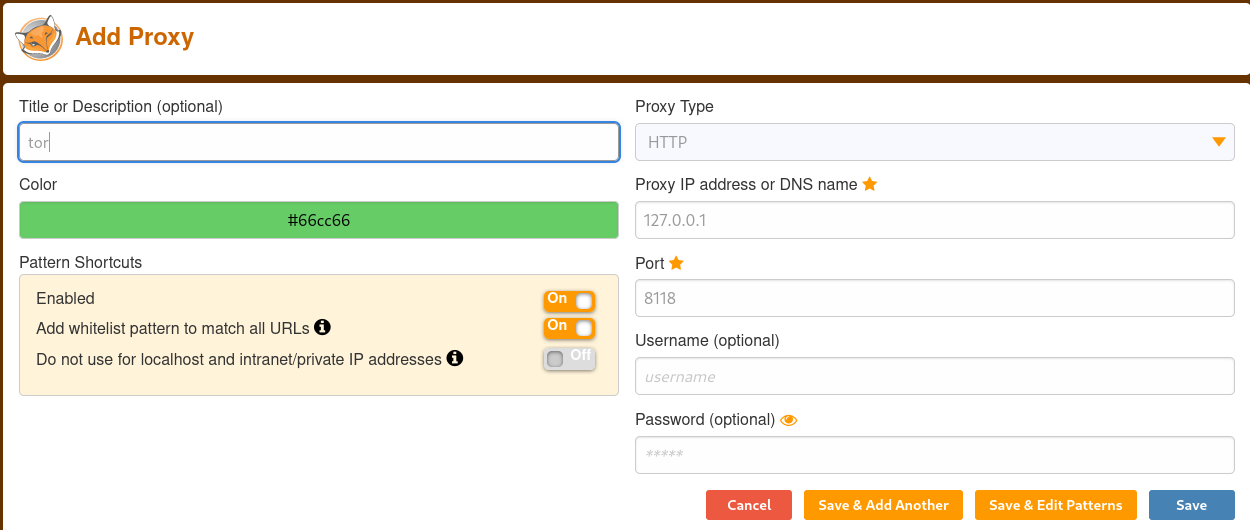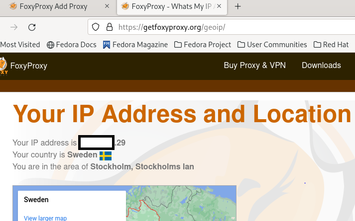 Save it and turn it on by clicking the foxyproxy icon again and then clicking on your creation. Reload the page and then click on the icon again and click "what's my ip?". If you see that your IP is different and probably in a different country, then you were successful.
