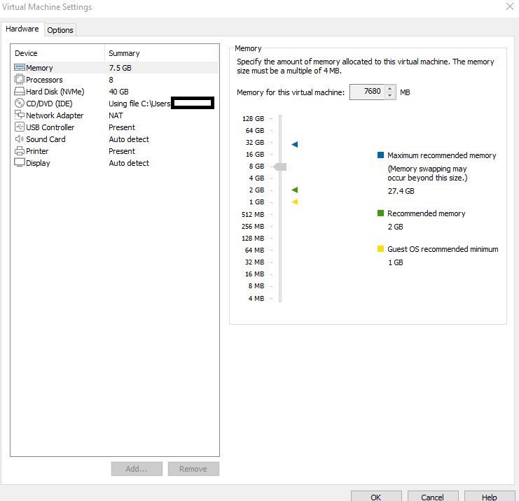 You can leave the default disk size or lower it but dont go under 15gb. I always store virtual disk as a single file for easier organization. You can customize the hardware to use your host's IP address or connect directly to the network using a bridged connection under the Network Adapter tab. You can leave all the default settings but it will run slow. Since I have the hardware resources available, I set it to 7.6 gb ram and 8 processor cores.