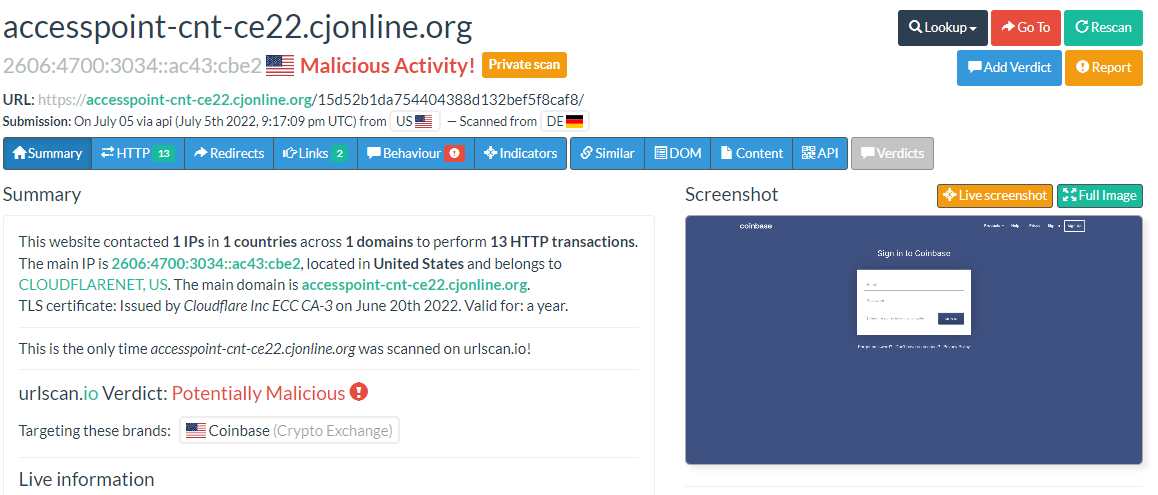 Here is the urlscan results of the page: